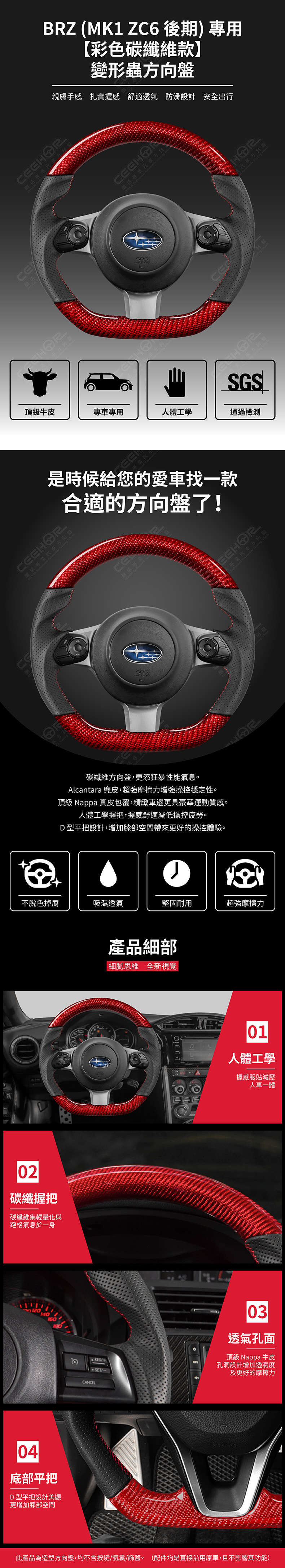 SUBARU 專用【彩色碳纖維款】變形蟲方向盤 適用車款: BRZ (2017-2020) MK1 ZC6 後期 ◆此為台灣生產製造保固,非中國淘寶品◆ ◆產品不含按鍵、氣囊、飾蓋,均是沿用原車◆ ◆照片及顯示中可能會有色差,牛皮顏色為黑色◆ ◆牛皮有皺褶為正常現象,我們使用100%真皮而非人造皮◆ ◆若您不確定您車款是否適用,請務必先訊息聊聊◆ 購買前須知 ☚ 我們產品均提供客製顏色服務,歡迎加LINE聊聊 ☚ 除了造型前衛、更具運動風、更有質感之外, 加大跑車凸點、整體加粗,握感更好! 左右人體工學握把設計,駕駛時更加舒適。 底部平把設計,美觀外也更增加膝部空間。 方向盤背面增加指扣,操控時更得心應手。