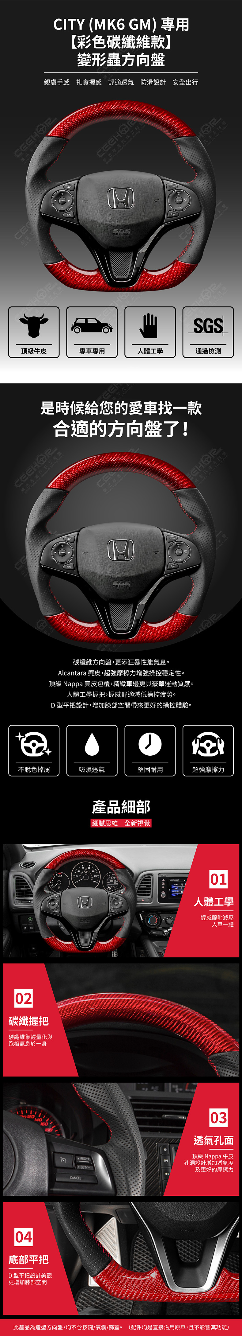 HONDA 專用【彩色碳纖維款】變形蟲方向盤 適用車款: City (2015-2020) MK6 GM ◆此為台灣生產製造保固,非中國淘寶品◆ ◆產品不含按鍵、氣囊、飾蓋,均是沿用原車◆ ◆照片及顯示中可能會有色差,牛皮顏色為黑色◆ ◆牛皮有皺褶為正常現象,我們使用100%真皮而非人造皮◆ ◆若您不確定您車款是否適用,請務必先訊息聊聊◆ 購買前須知 ☚ 我們產品均提供客製顏色服務,歡迎加LINE聊聊 ☚ 除了造型前衛、更具運動風、更有質感之外, 加大跑車凸點、整體加粗,握感更好! 左右人體工學握把設計,駕駛時更加舒適。 底部平把設計,美觀外也更增加膝部空間。 方向盤背面增加指扣,操控時更得心應手。