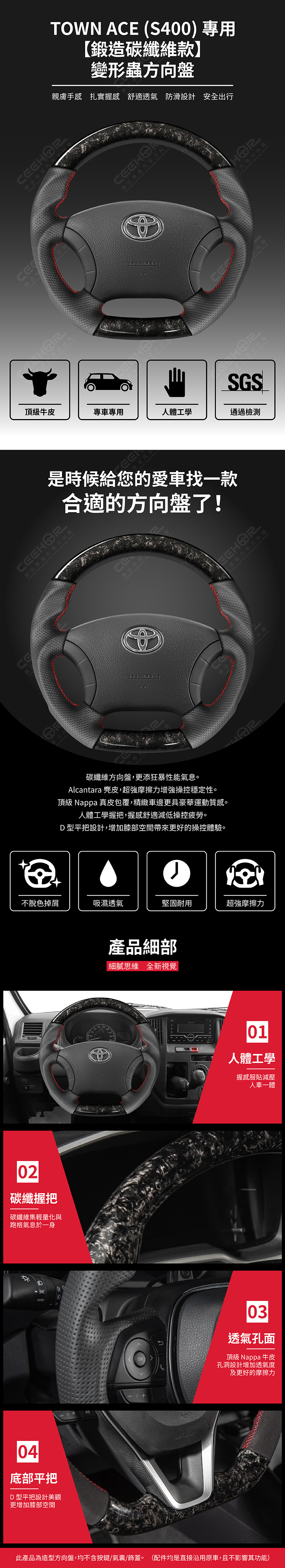 TOYOTA 專用【鍛造碳纖維款】變形蟲方向盤 適用車款: Town Ace Van (2020+) S400 ◆此為台灣生產製造保固,非中國淘寶品◆ ◆產品不含按鍵、氣囊、飾蓋,均是沿用原車◆ ◆照片及顯示中可能會有色差,牛皮顏色為黑色◆ ◆牛皮有皺褶為正常現象,我們使用100%真皮而非人造皮◆ ◆若您不確定您車款是否適用,請務必先訊息聊聊◆ 購買前須知 ☚ 我們產品均提供客製顏色服務,歡迎加LINE聊聊 ☚ 除了造型前衛、更具運動風、更有質感之外, 加大跑車凸點、整體加粗,握感更好! 左右人體工學握把設計,駕駛時更加舒適。 底部平把設計,美觀外也更增加膝部空間。 方向盤背面增加指扣,操控時更得心應手。