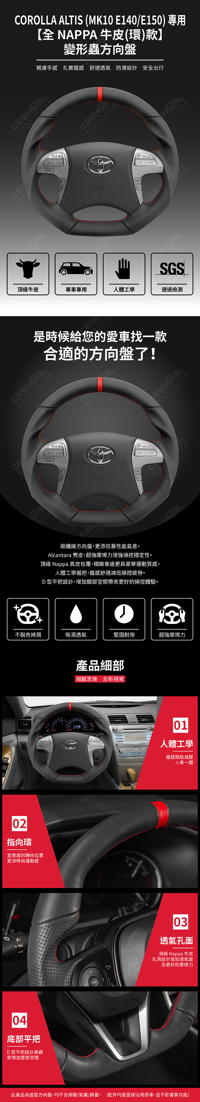 TOYOTA 專用【全NAPPA牛皮(紅環)款】變形蟲方向盤 適用車款: Corolla Altis (2008-2013) MK10 E140/E150 (Z版三幅不適用) ◆此為台灣生產製造保固,非中國淘寶品◆ ◆產品不含按鍵、氣囊、飾蓋,均是沿用原車◆ ◆照片及顯示中可能會有色差,牛皮顏色為黑色◆ ◆牛皮有皺褶為正常現象,我們使用100%真皮而非人造皮◆ ◆若您不確定您車款是否適用,請務必先訊息聊聊◆ 購買前須知 ☚ 我們產品均提供客製顏色服務,歡迎加LINE聊聊 ☚ 除了造型前衛、更具運動風、更有質感之外, 加大跑車凸點、整體加粗,握感更好! 左右人體工學握把設計,駕駛時更加舒適。 底部平把設計,美觀外也更增加膝部空間。 方向盤背面增加指扣,操控時更得心應手。