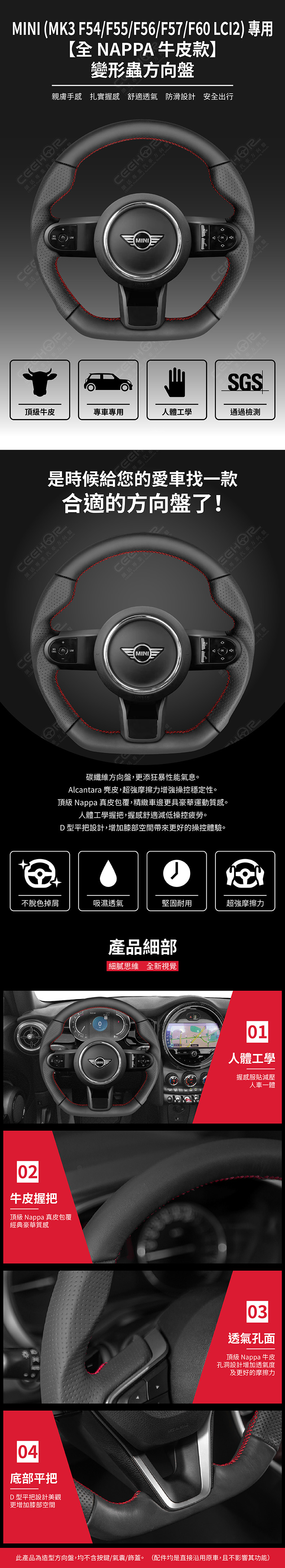 MINI 專用【全NAPPA牛皮款】變形蟲方向盤 適用車款: Cabrio (2021+) MK3 F57 後期 3D Hatch (2021+) MK3 F56 後期 5D Hatch (2021+) MK3 F55 後期 Clubman (2021+) MK3 F54 後期 Countryman (2021-2023) MK3 F60 後期 特別注意: 此造型方向盤不支援方向盤電熱功能, 如原車有電熱功能,電熱功能無法使用, 其餘功能均正常不影響。 ◆此為台灣生產製造保固,非中國淘寶品◆ ◆產品不含按鍵、氣囊、飾蓋,均是沿用原車◆ ◆照片及顯示中可能會有色差,牛皮顏色為黑色◆ ◆牛皮有皺褶為正常現象,我們使用100%真皮而非人造皮◆ ◆若您不確定您車款是否適用,請務必先訊息聊聊◆ 購買前須知 ☚ 我們產品均提供客製顏色服務,歡迎加LINE聊聊 ☚ 除了造型前衛、更具運動風、更有質感之外, 加大跑車凸點、整體加粗,握感更好! 左右人體工學握把設計,駕駛時更加舒適。 底部平把設計,美觀外也更增加膝部空間。 方向盤背面增加指扣,操控時更得心應手。