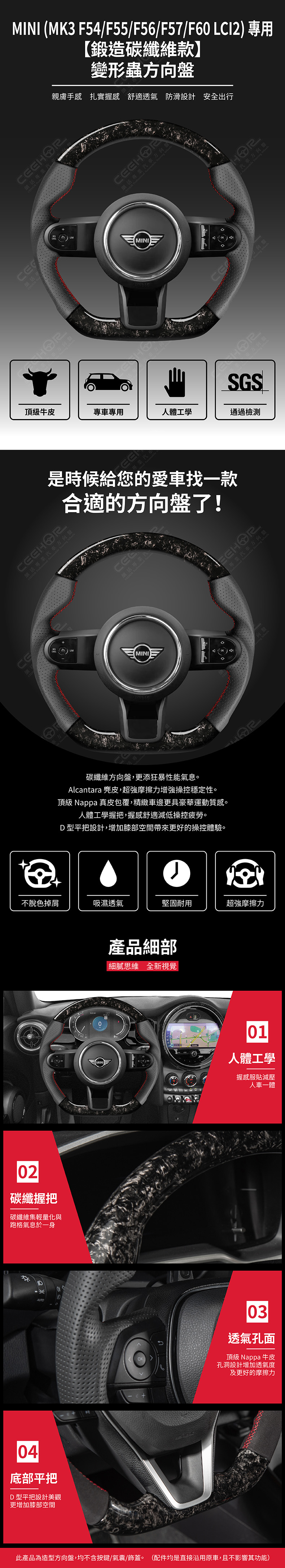 MINI 專用【鍛造碳纖維款】變形蟲方向盤 適用車款: Cabrio (2021+) MK3 F57 後期 3D Hatch (2021+) MK3 F56 後期 5D Hatch (2021+) MK3 F55 後期 Clubman (2021+) MK3 F54 後期 Countryman (2021-2023) MK3 F60 後期 特別注意: 此造型方向盤不支援方向盤電熱功能, 如原車有電熱功能,電熱功能無法使用, 其餘功能均正常不影響。 ◆此為台灣生產製造保固,非中國淘寶品◆ ◆產品不含按鍵、氣囊、飾蓋,均是沿用原車◆ ◆照片及顯示中可能會有色差,牛皮顏色為黑色◆ ◆牛皮有皺褶為正常現象,我們使用100%真皮而非人造皮◆ ◆若您不確定您車款是否適用,請務必先訊息聊聊◆ 購買前須知 ☚ 我們產品均提供客製顏色服務,歡迎加LINE聊聊 ☚ 除了造型前衛、更具運動風、更有質感之外, 加大跑車凸點、整體加粗,握感更好! 左右人體工學握把設計,駕駛時更加舒適。 底部平把設計,美觀外也更增加膝部空間。 方向盤背面增加指扣,操控時更得心應手。