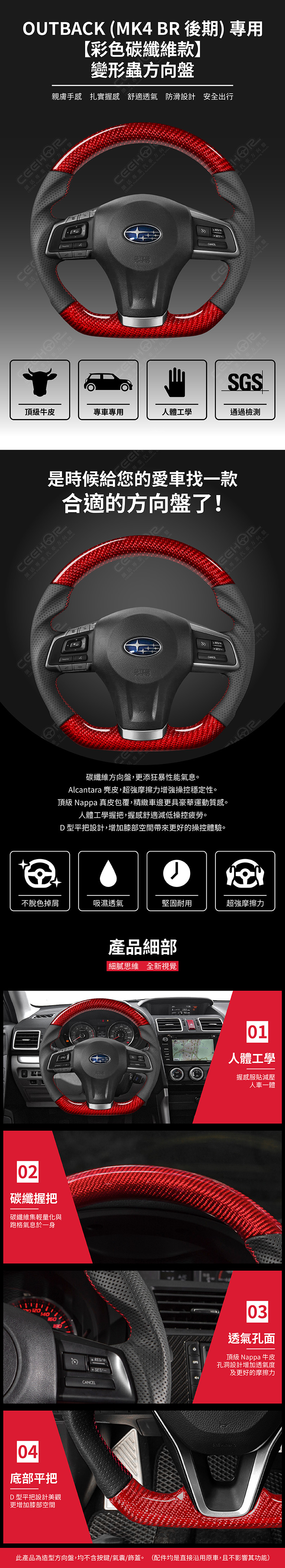 SUBARU 專用【彩色碳纖維款】變形蟲方向盤 適用車款: Outback (2013-2014) MK4 BR 後期 ◆此為台灣生產製造保固,非中國淘寶品◆ ◆產品不含按鍵、氣囊、飾蓋,均是沿用原車◆ ◆照片及顯示中可能會有色差,牛皮顏色為黑色◆ ◆牛皮有皺褶為正常現象,我們使用100%真皮而非人造皮◆ ◆若您不確定您車款是否適用,請務必先訊息聊聊◆ 購買前須知 ☚ 我們產品均提供客製顏色服務,歡迎加LINE聊聊 ☚ 除了造型前衛、更具運動風、更有質感之外, 加大跑車凸點、整體加粗,握感更好! 左右人體工學握把設計,駕駛時更加舒適。 底部平把設計,美觀外也更增加膝部空間。 方向盤背面增加指扣,操控時更得心應手。