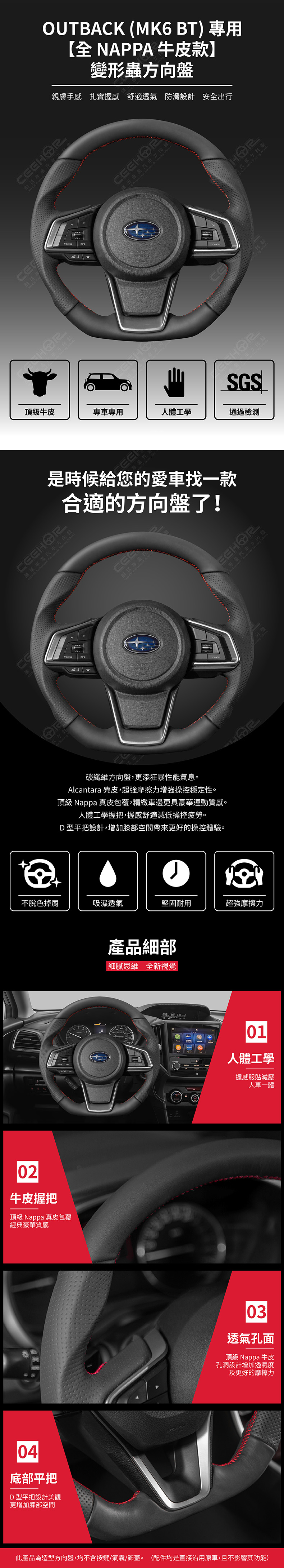 SUBARU 專用【全NAPPA牛皮款】變形蟲方向盤 適用車款: Outback (2021+) MK6 BT ◆此為台灣生產製造保固,非中國淘寶品◆ ◆產品不含按鍵、氣囊、飾蓋,均是沿用原車◆ ◆照片及顯示中可能會有色差,牛皮顏色為黑色◆ ◆牛皮有皺褶為正常現象,我們使用100%真皮而非人造皮◆ ◆若您不確定您車款是否適用,請務必先訊息聊聊◆ 購買前須知 ☚ 我們產品均提供客製顏色服務,歡迎加LINE聊聊 ☚ 除了造型前衛、更具運動風、更有質感之外, 加大跑車凸點、整體加粗,握感更好! 左右人體工學握把設計,駕駛時更加舒適。 底部平把設計,美觀外也更增加膝部空間。 方向盤背面增加指扣,操控時更得心應手。