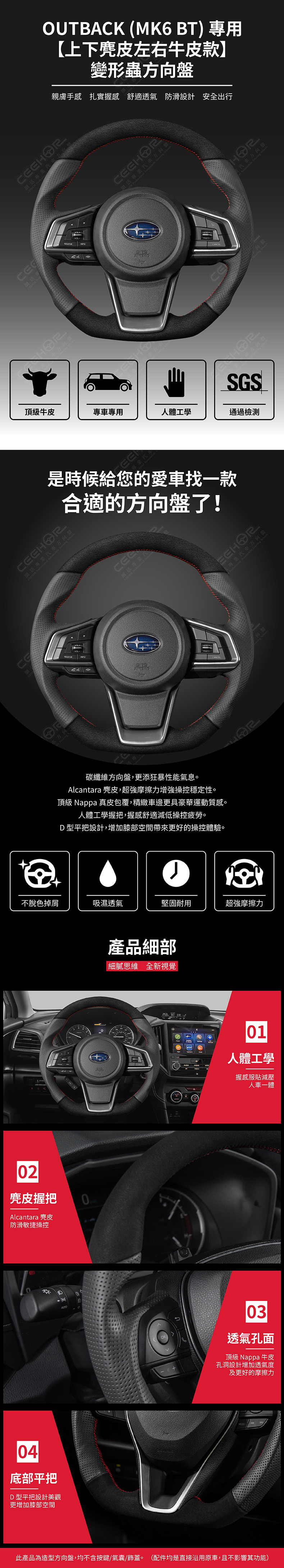 SUBARU 專用【上下麂皮左右牛皮款】變形蟲方向盤 適用車款: Outback (2021+) MK6 BT ◆此為台灣生產製造保固,非中國淘寶品◆ ◆產品不含按鍵、氣囊、飾蓋,均是沿用原車◆ ◆照片及顯示中可能會有色差,牛皮顏色為黑色◆ ◆牛皮有皺褶為正常現象,我們使用100%真皮而非人造皮◆ ◆若您不確定您車款是否適用,請務必先訊息聊聊◆ 購買前須知 ☚ 我們產品均提供客製顏色服務,歡迎加LINE聊聊 ☚ 除了造型前衛、更具運動風、更有質感之外, 加大跑車凸點、整體加粗,握感更好! 左右人體工學握把設計,駕駛時更加舒適。 底部平把設計,美觀外也更增加膝部空間。 方向盤背面增加指扣,操控時更得心應手。