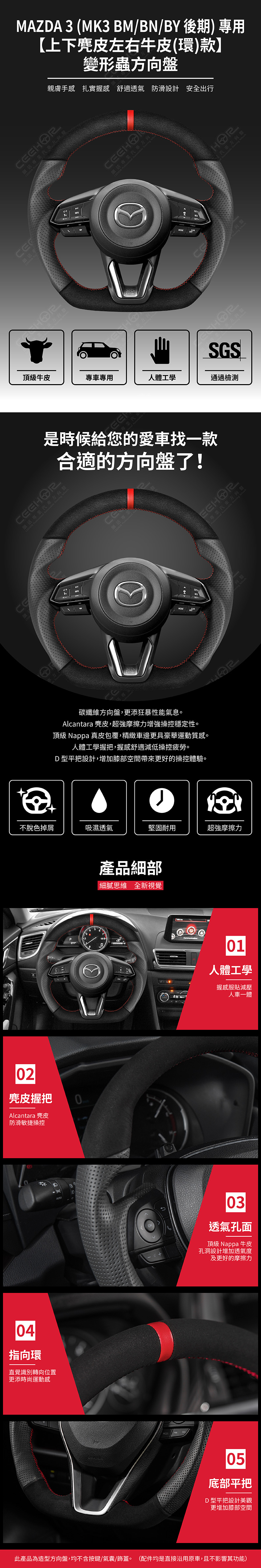 MAZDA 專用【上下麂皮左右牛皮(紅環)款】變形蟲方向盤 適用車款: Mazda3 (2017-2019) MK3 BM,BN,BY 後期 ◆此為台灣生產製造保固,非中國淘寶品◆ ◆產品不含按鍵、氣囊、飾蓋,均是沿用原車◆ ◆照片及顯示中可能會有色差,牛皮顏色為黑色◆ ◆牛皮有皺褶為正常現象,我們使用100%真皮而非人造皮◆ ◆若您不確定您車款是否適用,請務必先訊息聊聊◆ 購買前須知 ☚ 我們產品均提供客製顏色服務,歡迎加LINE聊聊 ☚ 除了造型前衛、更具運動風、更有質感之外, 加大跑車凸點、整體加粗,握感更好! 左右人體工學握把設計,駕駛時更加舒適。 底部平把設計,美觀外也更增加膝部空間。 方向盤背面增加指扣,操控時更得心應手。