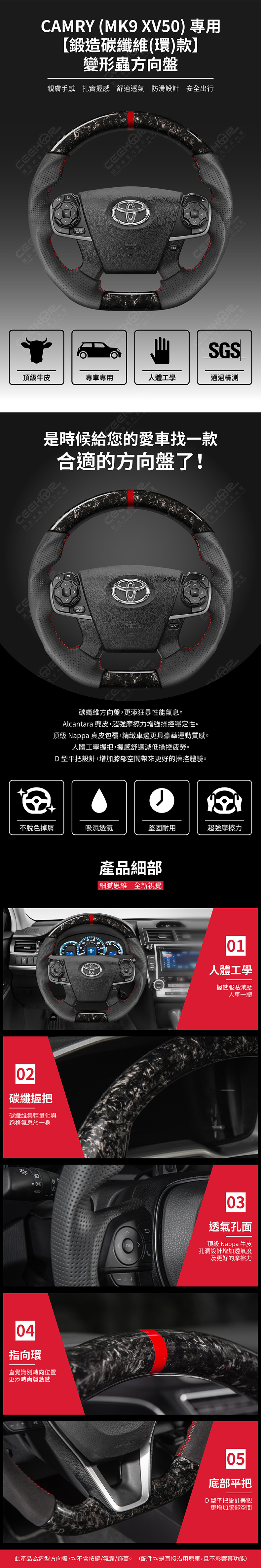 TOYOTA 專用【鍛造碳纖維(紅環)款】變形蟲方向盤 適用車款: Camry (2012-2018) MK9 XV50 ◆此為台灣生產製造保固,非中國淘寶品◆ ◆產品不含按鍵、氣囊、飾蓋,均是沿用原車◆ ◆照片及顯示中可能會有色差,牛皮顏色為黑色◆ ◆牛皮有皺褶為正常現象,我們使用100%真皮而非人造皮◆ ◆若您不確定您車款是否適用,請務必先訊息聊聊◆ 購買前須知 ☚ 我們產品均提供客製顏色服務,歡迎加LINE聊聊 ☚ 除了造型前衛、更具運動風、更有質感之外, 加大跑車凸點、整體加粗,握感更好! 左右人體工學握把設計,駕駛時更加舒適。 底部平把設計,美觀外也更增加膝部空間。 方向盤背面增加指扣,操控時更得心應手。