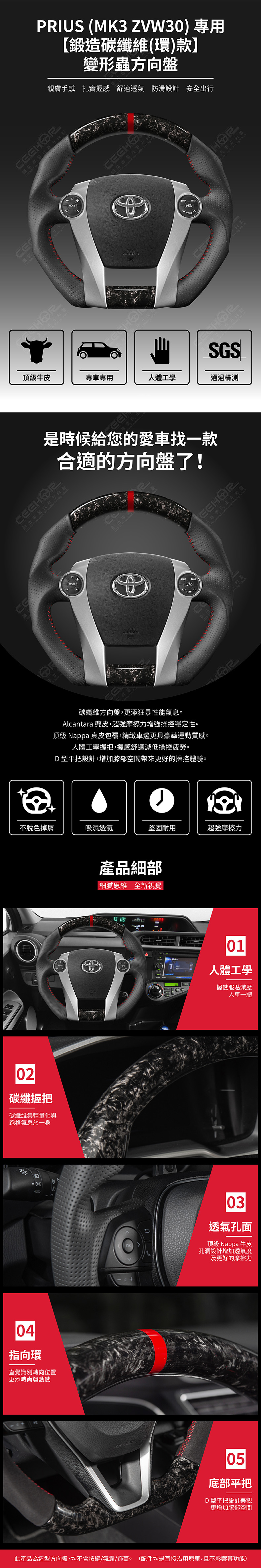 TOYOTA 專用【鍛造碳纖維(紅環)款】變形蟲方向盤 適用車款: Prius (2009-2015) MK3 ZVW30 ◆此為台灣生產製造保固,非中國淘寶品◆ ◆產品不含按鍵、氣囊、飾蓋,均是沿用原車◆ ◆照片及顯示中可能會有色差,牛皮顏色為黑色◆ ◆牛皮有皺褶為正常現象,我們使用100%真皮而非人造皮◆ ◆若您不確定您車款是否適用,請務必先訊息聊聊◆ 購買前須知 ☚ 我們產品均提供客製顏色服務,歡迎加LINE聊聊 ☚ 除了造型前衛、更具運動風、更有質感之外, 加大跑車凸點、整體加粗,握感更好! 左右人體工學握把設計,駕駛時更加舒適。 底部平把設計,美觀外也更增加膝部空間。 方向盤背面增加指扣,操控時更得心應手。