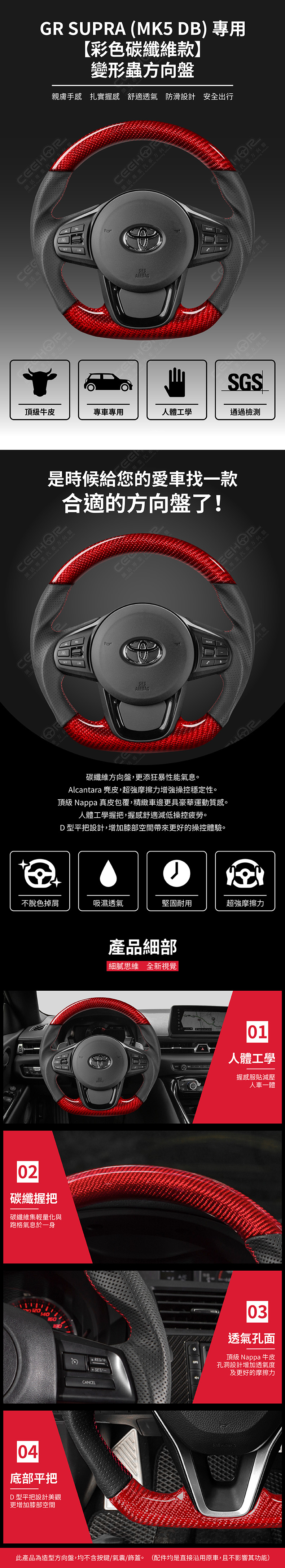 TOYOTA 專用【彩色碳纖維款】變形蟲方向盤 適用車款: GR Supra (2019+) MK5 DB ◆此為台灣生產製造保固,非中國淘寶品◆ ◆產品不含按鍵、氣囊、飾蓋,均是沿用原車◆ ◆照片及顯示中可能會有色差,牛皮顏色為黑色◆ ◆牛皮有皺褶為正常現象,我們使用100%真皮而非人造皮◆ ◆若您不確定您車款是否適用,請務必先訊息聊聊◆ 購買前須知 ☚ 我們產品均提供客製顏色服務,歡迎加LINE聊聊 ☚ 除了造型前衛、更具運動風、更有質感之外, 加大跑車凸點、整體加粗,握感更好! 左右人體工學握把設計,駕駛時更加舒適。 底部平把設計,美觀外也更增加膝部空間。 方向盤背面增加指扣,操控時更得心應手。