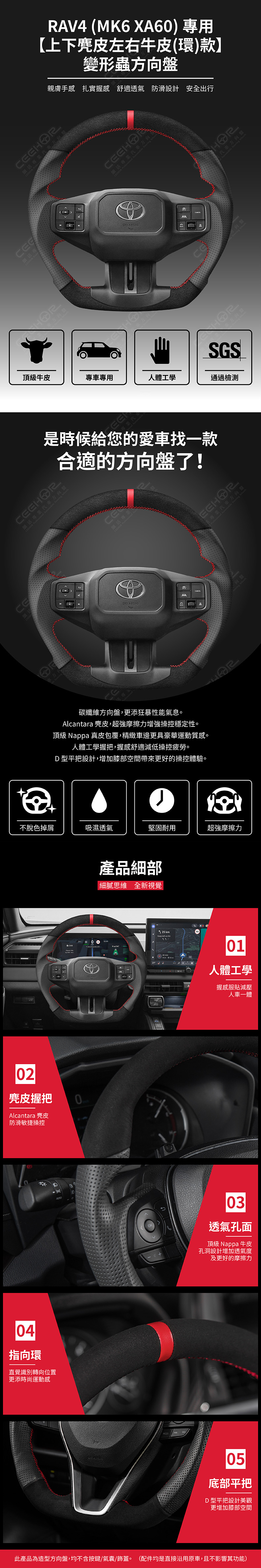 TOYOTA 專用【上下麂皮左右牛皮(紅環)款】變形蟲方向盤 適用車款: RAV4 (2026+) MK6 XA60 特別注意: 此造型方向盤不支援方向盤電熱功能, 如原車有電熱功能,電熱功能無法使用, 其餘功能均正常不影響。 ◆此為台灣生產製造保固,非中國淘寶品◆ ◆產品不含按鍵、氣囊、飾蓋,均是沿用原車◆ ◆照片及顯示中可能會有色差,牛皮顏色為黑色◆ ◆牛皮有皺褶為正常現象,我們使用100%真皮而非人造皮◆ ◆若您不確定您車款是否適用,請務必先訊息聊聊◆ 購買前須知 ☚ 我們產品均提供客製顏色服務,歡迎加LINE聊聊 ☚ 除了造型前衛、更具運動風、更有質感之外, 加大跑車凸點、整體加粗,握感更好! 左右人體工學握把設計,駕駛時更加舒適。 底部平把設計,美觀外也更增加膝部空間。 方向盤背面增加指扣,操控時更得心應手。