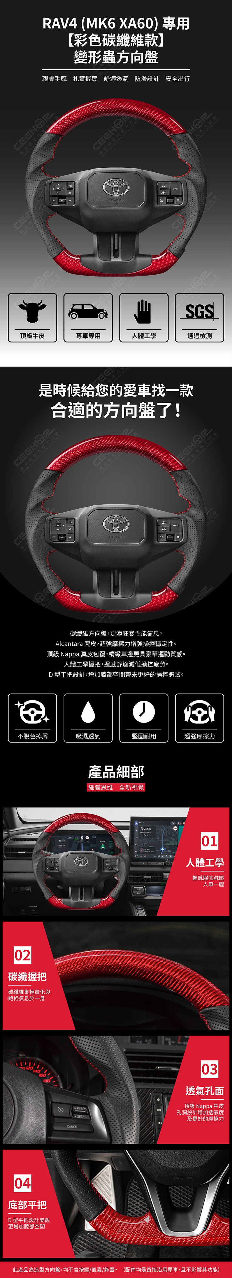 TOYOTA 專用【彩色碳纖維款】變形蟲方向盤 適用車款: RAV4 (2026+) MK6 XA60 特別注意: 此造型方向盤不支援方向盤電熱功能, 如原車有電熱功能,電熱功能無法使用, 其餘功能均正常不影響。 ◆此為台灣生產製造保固,非中國淘寶品◆ ◆產品不含按鍵、氣囊、飾蓋,均是沿用原車◆ ◆照片及顯示中可能會有色差,牛皮顏色為黑色◆ ◆牛皮有皺褶為正常現象,我們使用100%真皮而非人造皮◆ ◆若您不確定您車款是否適用,請務必先訊息聊聊◆ 購買前須知 ☚ 我們產品均提供客製顏色服務,歡迎加LINE聊聊 ☚ 除了造型前衛、更具運動風、更有質感之外, 加大跑車凸點、整體加粗,握感更好! 左右人體工學握把設計,駕駛時更加舒適。 底部平把設計,美觀外也更增加膝部空間。 方向盤背面增加指扣,操控時更得心應手。
