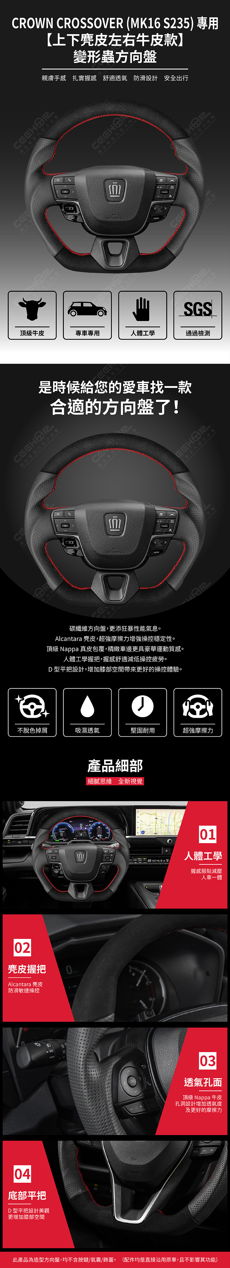 TOYOTA 專用【上下麂皮左右牛皮款】變形蟲方向盤 適用車款: Crown Crossover (2022+) MK16 S235 ◆此為台灣生產製造保固,非中國淘寶品◆ ◆產品不含按鍵、氣囊、飾蓋,均是沿用原車◆ ◆照片及顯示中可能會有色差,牛皮顏色為黑色◆ ◆牛皮有皺褶為正常現象,我們使用100%真皮而非人造皮◆ ◆若您不確定您車款是否適用,請務必先訊息聊聊◆ 購買前須知 ☚ 我們產品均提供客製顏色服務,歡迎加LINE聊聊 ☚ 除了造型前衛、更具運動風、更有質感之外, 加大跑車凸點、整體加粗,握感更好! 左右人體工學握把設計,駕駛時更加舒適。 底部平把設計,美觀外也更增加膝部空間。 方向盤背面增加指扣,操控時更得心應手。