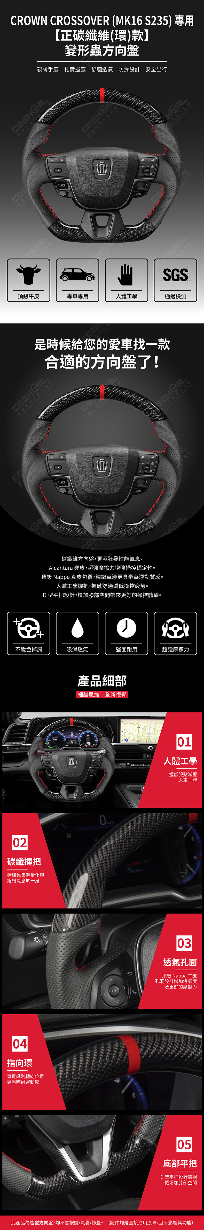 TOYOTA 專用【正碳纖維(紅環)款】變形蟲方向盤 適用車款: Crown Crossover (2022+) MK16 S235 ◆此為台灣生產製造保固,非中國淘寶品◆ ◆產品不含按鍵、氣囊、飾蓋,均是沿用原車◆ ◆照片及顯示中可能會有色差,牛皮顏色為黑色◆ ◆牛皮有皺褶為正常現象,我們使用100%真皮而非人造皮◆ ◆若您不確定您車款是否適用,請務必先訊息聊聊◆ 購買前須知 ☚ 我們產品均提供客製顏色服務,歡迎加LINE聊聊 ☚ 除了造型前衛、更具運動風、更有質感之外, 加大跑車凸點、整體加粗,握感更好! 左右人體工學握把設計,駕駛時更加舒適。 底部平把設計,美觀外也更增加膝部空間。 方向盤背面增加指扣,操控時更得心應手。