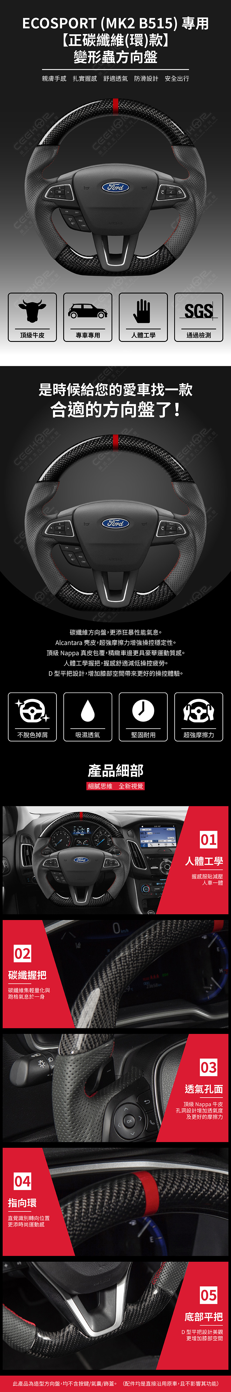 FORD 專用【正碳纖維(紅環)款】變形蟲方向盤 適用車款: Ecosport (2018-2023) MK2 B515 Ecosport ST-Line (2018-2023) MK2 B515 特別注意: 有預留撥片孔位,原車須有換檔撥片功能。 ◆此為台灣生產製造保固,非中國淘寶品◆ ◆產品不含按鍵、氣囊、飾蓋,均是沿用原車◆ ◆照片及顯示中可能會有色差,牛皮顏色為黑色◆ ◆牛皮有皺褶為正常現象,我們使用100%真皮而非人造皮◆ ◆若您不確定您車款是否適用,請務必先訊息聊聊◆ 購買前須知 ☚ 我們產品均提供客製顏色服務,歡迎加LINE聊聊 ☚ 除了造型前衛、更具運動風、更有質感之外, 加大跑車凸點、整體加粗,握感更好! 左右人體工學握把設計,駕駛時更加舒適。 底部平把設計,美觀外也更增加膝部空間。 方向盤背面增加指扣,操控時更得心應手。