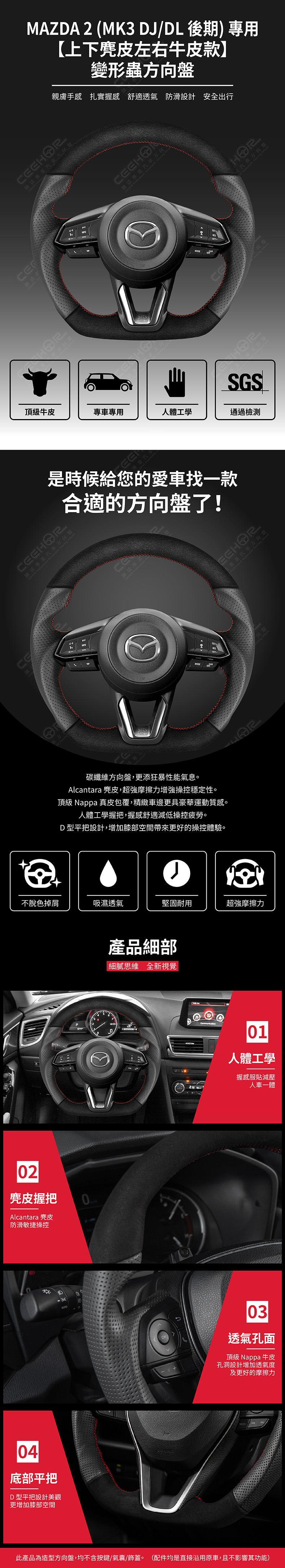 MAZDA 專用【上下麂皮左右牛皮款】變形蟲方向盤 適用車款: Mazda2 (2018+) MK3 DJ,DL 後期 ◆此為台灣生產製造保固,非中國淘寶品◆ ◆產品不含按鍵、氣囊、飾蓋,均是沿用原車◆ ◆照片及顯示中可能會有色差,牛皮顏色為黑色◆ ◆牛皮有皺褶為正常現象,我們使用100%真皮而非人造皮◆ ◆若您不確定您車款是否適用,請務必先訊息聊聊◆ 購買前須知 ☚ 我們產品均提供客製顏色服務,歡迎加LINE聊聊 ☚ 除了造型前衛、更具運動風、更有質感之外, 加大跑車凸點、整體加粗,握感更好! 左右人體工學握把設計,駕駛時更加舒適。 底部平把設計,美觀外也更增加膝部空間。 方向盤背面增加指扣,操控時更得心應手。
