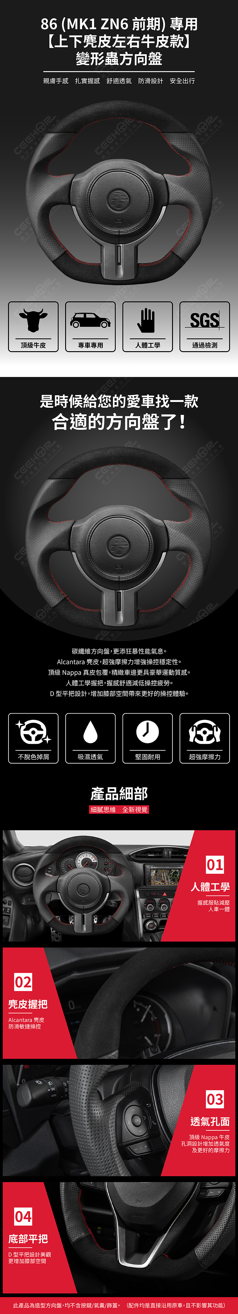 TOYOTA 專用【上下麂皮左右牛皮款】變形蟲方向盤 適用車款: 86 (2012-2016) MK1 ZN6 前期 ◆此為台灣生產製造保固,非中國淘寶品◆ ◆產品不含按鍵、氣囊、飾蓋,均是沿用原車◆ ◆照片及顯示中可能會有色差,牛皮顏色為黑色◆ ◆牛皮有皺褶為正常現象,我們使用100%真皮而非人造皮◆ ◆若您不確定您車款是否適用,請務必先訊息聊聊◆ 購買前須知 ☚ 我們產品均提供客製顏色服務,歡迎加LINE聊聊 ☚ 除了造型前衛、更具運動風、更有質感之外, 加大跑車凸點、整體加粗,握感更好! 左右人體工學握把設計,駕駛時更加舒適。 底部平把設計,美觀外也更增加膝部空間。 方向盤背面增加指扣,操控時更得心應手。
