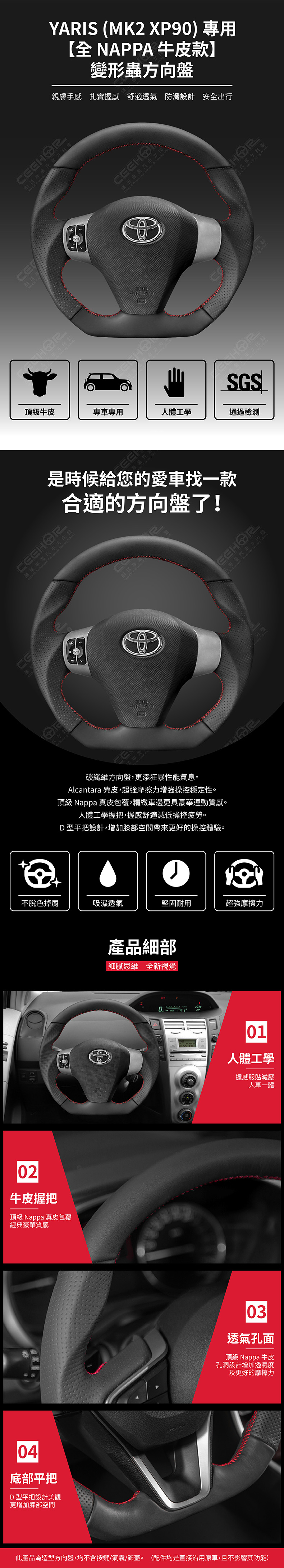 TOYOTA 專用【全NAPPA牛皮款】變形蟲方向盤 適用車款: Yaris (2006-2013) MK2 XP90 ◆此為台灣生產製造保固,非中國淘寶品◆ ◆產品不含按鍵、氣囊、飾蓋,均是沿用原車◆ ◆照片及顯示中可能會有色差,牛皮顏色為黑色◆ ◆牛皮有皺褶為正常現象,我們使用100%真皮而非人造皮◆ ◆若您不確定您車款是否適用,請務必先訊息聊聊◆ 購買前須知 ☚ 我們產品均提供客製顏色服務,歡迎加LINE聊聊 ☚ 除了造型前衛、更具運動風、更有質感之外, 加大跑車凸點、整體加粗,握感更好! 左右人體工學握把設計,駕駛時更加舒適。 底部平把設計,美觀外也更增加膝部空間。 方向盤背面增加指扣,操控時更得心應手。