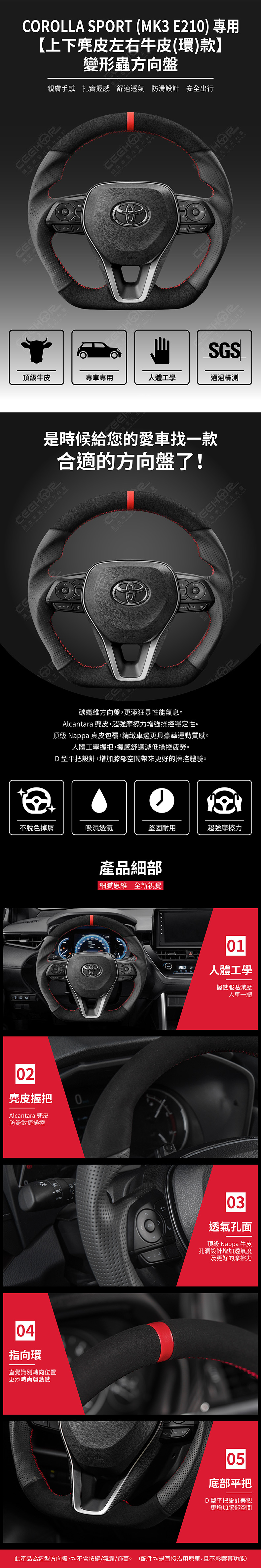 TOYOTA 專用【上下麂皮左右牛皮(紅環)款】變形蟲方向盤 適用車款: Corolla Sport (2018+) MK3 E210 ◆此為台灣生產製造保固,非中國淘寶品◆ ◆產品不含按鍵、氣囊、飾蓋,均是沿用原車◆ ◆照片及顯示中可能會有色差,牛皮顏色為黑色◆ ◆牛皮有皺褶為正常現象,我們使用100%真皮而非人造皮◆ ◆若您不確定您車款是否適用,請務必先訊息聊聊◆ 購買前須知 ☚ 我們產品均提供客製顏色服務,歡迎加LINE聊聊 ☚ 除了造型前衛、更具運動風、更有質感之外, 加大跑車凸點、整體加粗,握感更好! 左右人體工學握把設計,駕駛時更加舒適。 底部平把設計,美觀外也更增加膝部空間。 方向盤背面增加指扣,操控時更得心應手。
