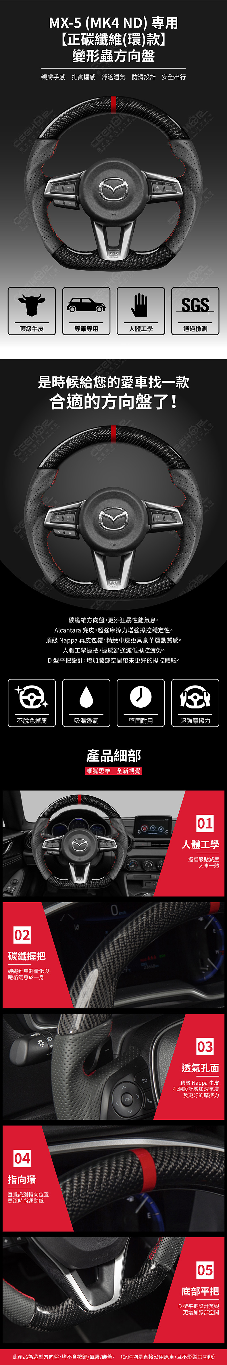 MAZDA 專用【正碳纖維(紅環)款】變形蟲方向盤 適用車款: MX-5 (2016+) MK4 ND MX-5 RF (2016+) MK4 ND ◆此為台灣生產製造保固,非中國淘寶品◆ ◆產品不含按鍵、氣囊、飾蓋,均是沿用原車◆ ◆照片及顯示中可能會有色差,牛皮顏色為黑色◆ ◆牛皮有皺褶為正常現象,我們使用100%真皮而非人造皮◆ ◆若您不確定您車款是否適用,請務必先訊息聊聊◆ 購買前須知 ☚ 我們產品均提供客製顏色服務,歡迎加LINE聊聊 ☚ 除了造型前衛、更具運動風、更有質感之外, 加大跑車凸點、整體加粗,握感更好! 左右人體工學握把設計,駕駛時更加舒適。 底部平把設計,美觀外也更增加膝部空間。 方向盤背面增加指扣,操控時更得心應手。
