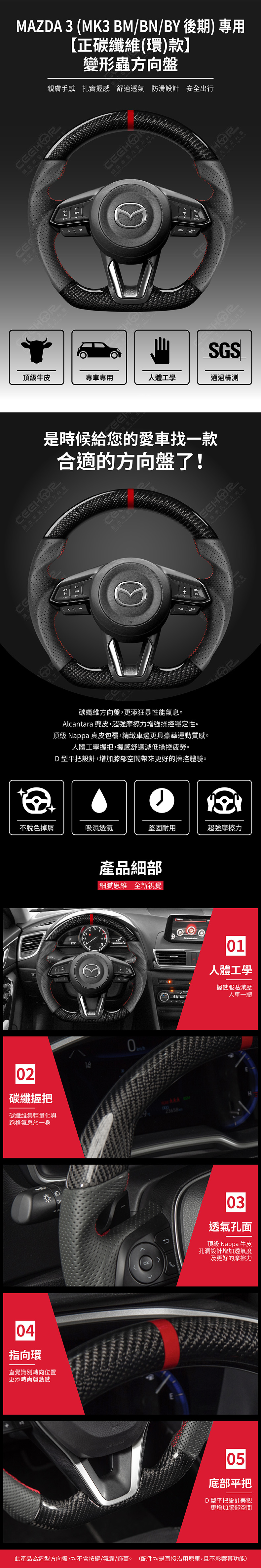 MAZDA 專用【正碳纖維(紅環)款】變形蟲方向盤 適用車款: Mazda3 (2017-2019) MK3 BM,BN,BY 後期 ◆此為台灣生產製造保固,非中國淘寶品◆ ◆產品不含按鍵、氣囊、飾蓋,均是沿用原車◆ ◆照片及顯示中可能會有色差,牛皮顏色為黑色◆ ◆牛皮有皺褶為正常現象,我們使用100%真皮而非人造皮◆ ◆若您不確定您車款是否適用,請務必先訊息聊聊◆ 購買前須知 ☚ 我們產品均提供客製顏色服務,歡迎加LINE聊聊 ☚ 除了造型前衛、更具運動風、更有質感之外, 加大跑車凸點、整體加粗,握感更好! 左右人體工學握把設計,駕駛時更加舒適。 底部平把設計,美觀外也更增加膝部空間。 方向盤背面增加指扣,操控時更得心應手。